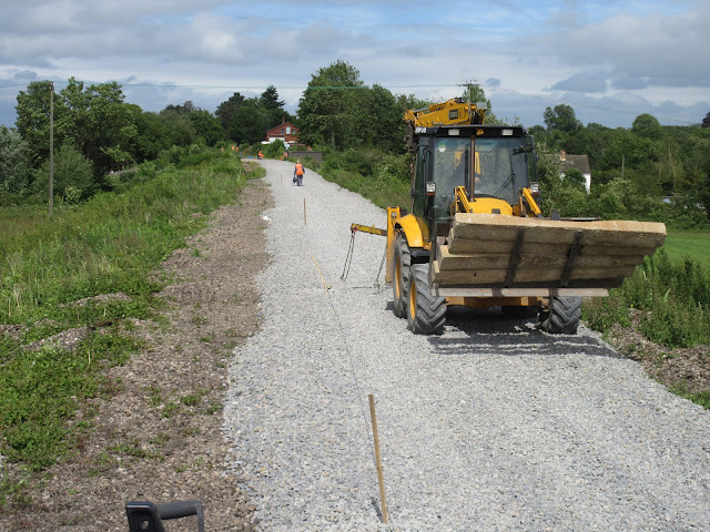 It was breezy, humid and often sunny day, one which left us shivering and sweating at alternate moments. Here we are walking down to the 'coal face' first thing in the morning, having car pooled to the rough new car park at Childswickham. Nigel is already on site and has spent the time well - several big piles of sleepers are stacked by Pry Lane bridge, waiting for the JCB and the rest of the gang to start work.