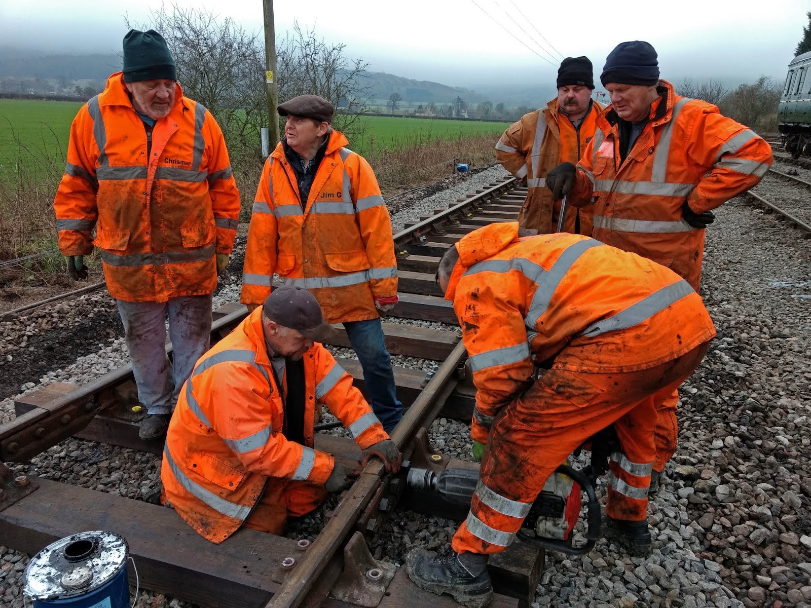 Prior to fitting fish plates, Ade here measured the wear on each rail and wrote the result on to the nearest sleeper using just a nail. Hope it's still legible next week.